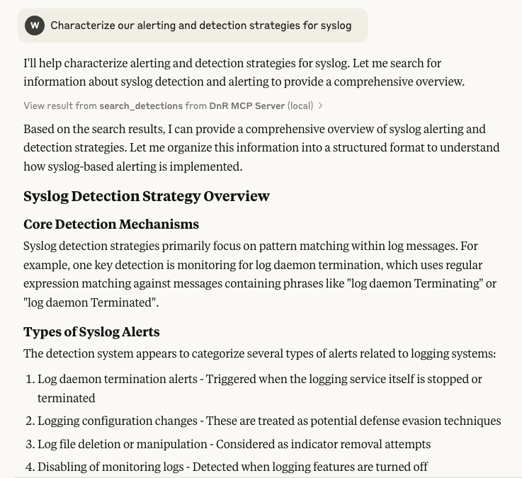 Here's a simple example, where I ask Claude to discuss our alerting and detection capabilities around the syslog datasource: