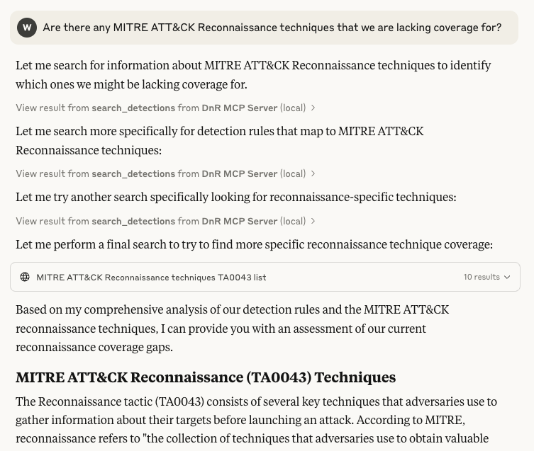 With this new capability I can ask questions in plain english about content in our library. Claude will combine the innate knowledge of the LLM with our existing codebase. For example, concepts around the MITRE ATT&CK framework are already known by the LLM but answers involving those tactics are improved with detailed knowledge of our codebase.